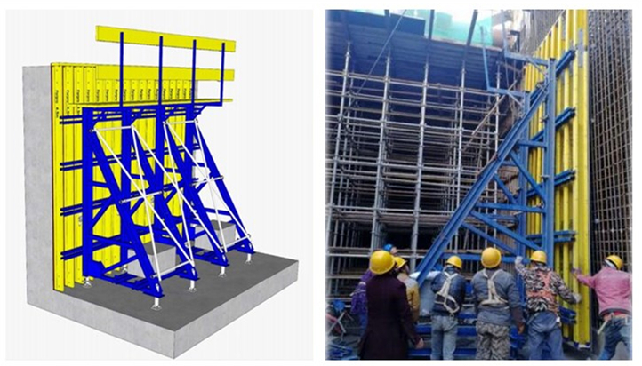 采用定型化模板施工。傳統(tǒng)國(guó)內(nèi)地下工程模板支架多采用鋼管架(或碗扣架)+木模板的形式,人材機(jī)投入大,安拆周期長(zhǎng),而且搭設(shè)過(guò)程中控制細(xì)節(jié)多,質(zhì)量不易保證,安全風(fēng)險(xiǎn)大。為此軌道交通項(xiàng)目側(cè)墻施工采用大膠合板+木工字梁+桁架支撐的單側(cè)模板臺(tái)車體系。其組裝簡(jiǎn)便,利于現(xiàn)場(chǎng)快節(jié)奏的流水施工;整體承載力較大,能抵抗不同混凝土側(cè)壓力;可變高度,可適應(yīng)不同墻體高度;可利用小型輪車進(jìn)行整體轉(zhuǎn)移,節(jié)省現(xiàn)場(chǎng)塔吊臺(tái)班量;采用在板上預(yù)埋錨固裝置,側(cè)墻上無(wú)需預(yù)埋,可完全實(shí)現(xiàn)清水墻效果。據(jù)統(tǒng)計(jì)平均每塊墻板縮短工期約10天。在保證質(zhì)量的同時(shí)極大縮短工期。