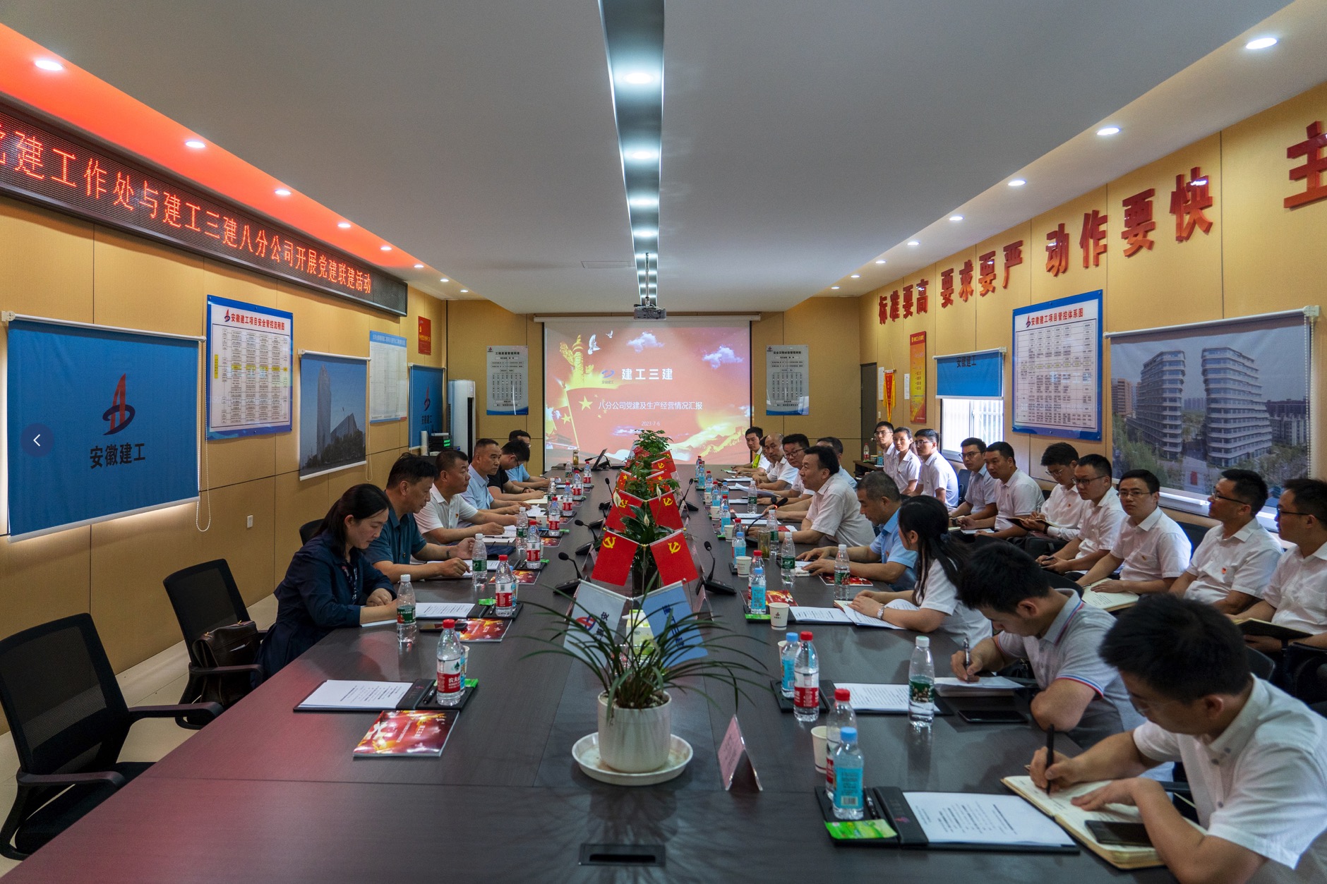 為深入貫徹落實主題教育工作要求,創(chuàng)新基層黨建工作載體,構(gòu)建雙向促進(jìn)、共同提高的黨建工作格局,7月6日,省國資委黨建工作處黨支部走進(jìn)建工三建八公司大圩金葡萄家園二期2-A和2-B地塊工程項目,開展黨建聯(lián)建活動。省國資委黨建工作處處長、黨支部書記段海出席并講授專題黨課。建工控股黨委委員、紀(jì)委書記、監(jiān)察專員王汪苗參加活動。