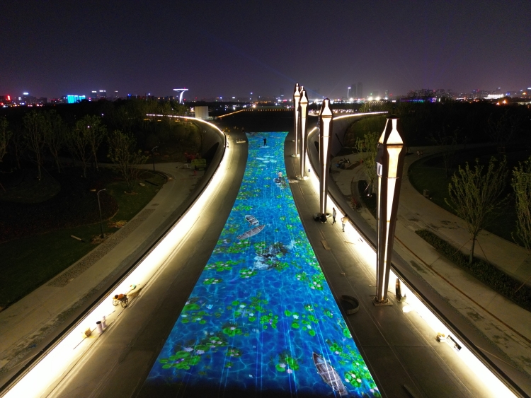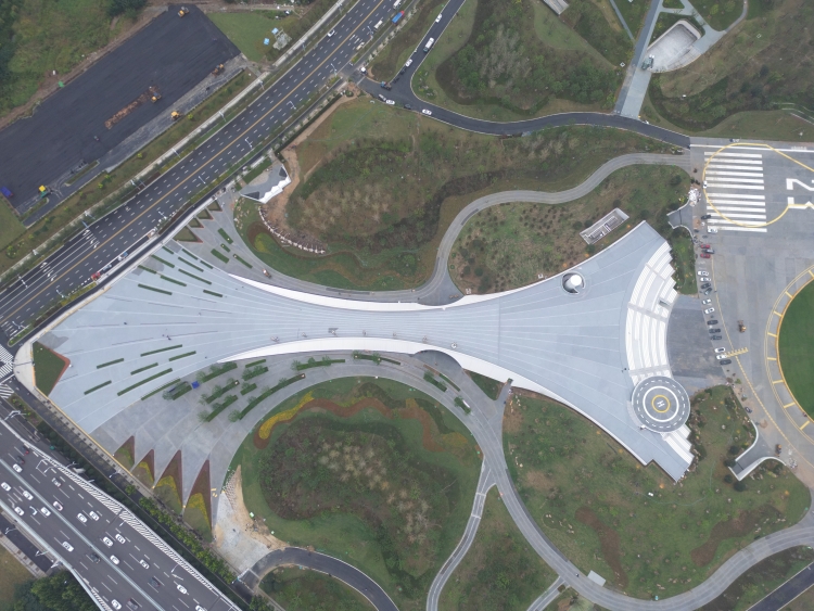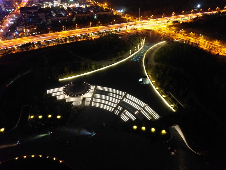 如今,站在合肥園博園南入口寬闊的廣場(chǎng)上,可以看到數(shù)根細(xì)長(zhǎng)的線條從腳下一直向坡道盡頭延伸,象征著飛機(jī)爬升過(guò)程中的氣流形態(tài)。沿著150米長(zhǎng)的緩坡道步行而上,可見(jiàn)右側(cè)聳立著七根高度為11.5米的有著“七星攬?jiān)隆泵雷u(yù)的景觀燈,夜間不僅能為游客帶來(lái)暖色的柔和燈光,最頂端碩大的全色激光投影儀還能在坡道面上投下美輪美奐的動(dòng)態(tài)畫(huà)面,將入口裝點(diǎn)得更加夢(mèng)幻。登頂8米高的觀景平臺(tái),右側(cè)是圓形的直升機(jī)停機(jī)坪,向遠(yuǎn)方眺望,3公里長(zhǎng)的機(jī)場(chǎng)大草坪和整個(gè)園博園的景色盡收眼底,引人不由駐足觀賞。
