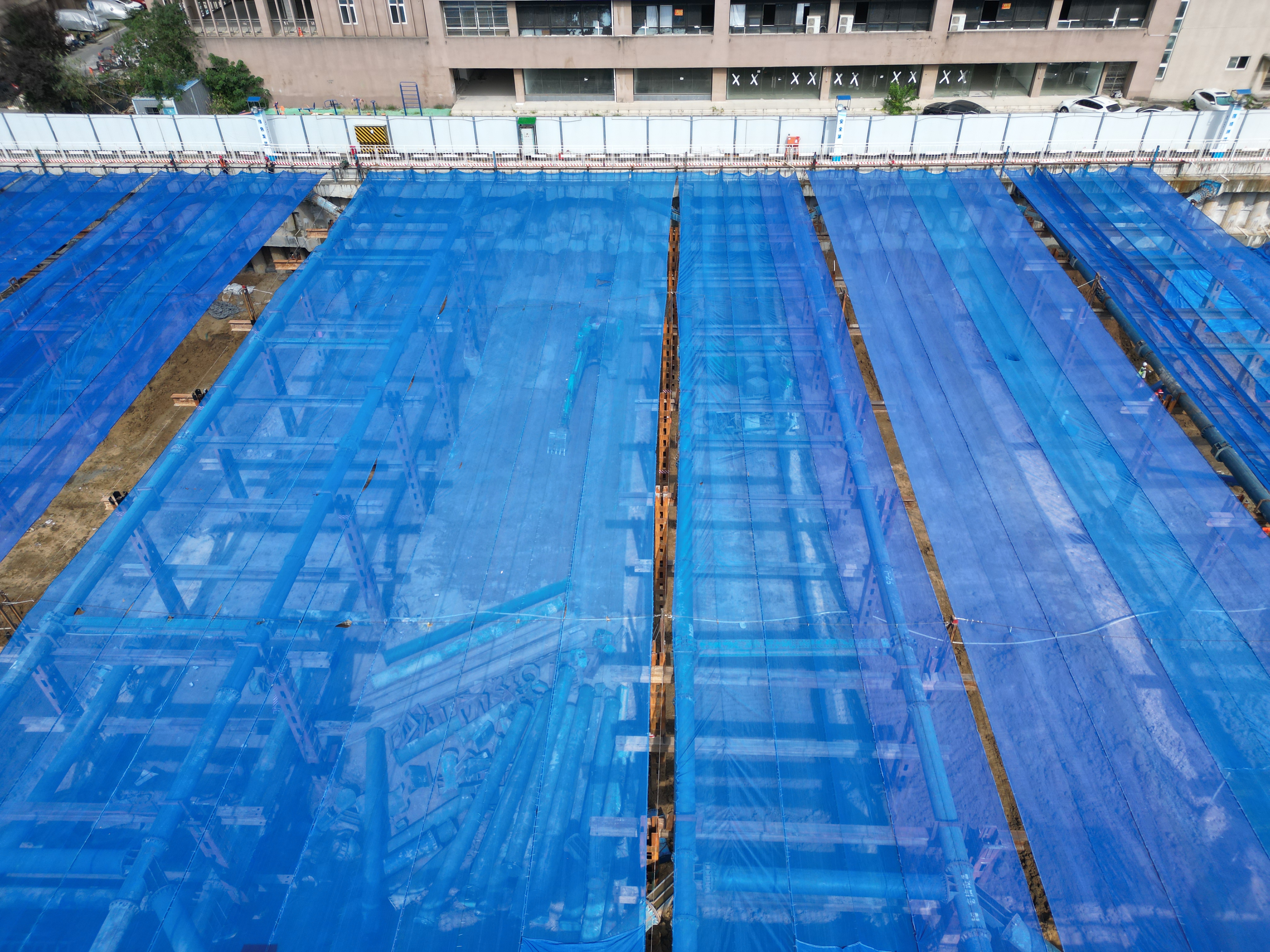 該項(xiàng)目距離市二院住院部及居民區(qū)較近,為減小對人居環(huán)境的影響,啟用“天幕系統(tǒng)”是貫徹落實(shí)高質(zhì)量發(fā)展、探索綠色低碳發(fā)展的切實(shí)舉措。與傳統(tǒng)的施工作業(yè)相比,防塵天幕能夠減少80%以上的揚(yáng)塵,實(shí)現(xiàn)6520平方米的基坑全覆蓋。在土方開挖和錨噴作業(yè)過程中,啟用基坑防塵天幕系統(tǒng)的同時與噴淋系統(tǒng)結(jié)合使用,通過“天幕”系統(tǒng)將“露天作業(yè)”變?yōu)椤笆覂?nèi)作業(yè)”,實(shí)現(xiàn)整個基坑施工場地“綠色封閉式”管理。