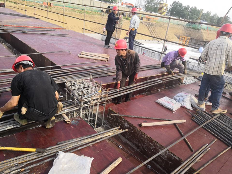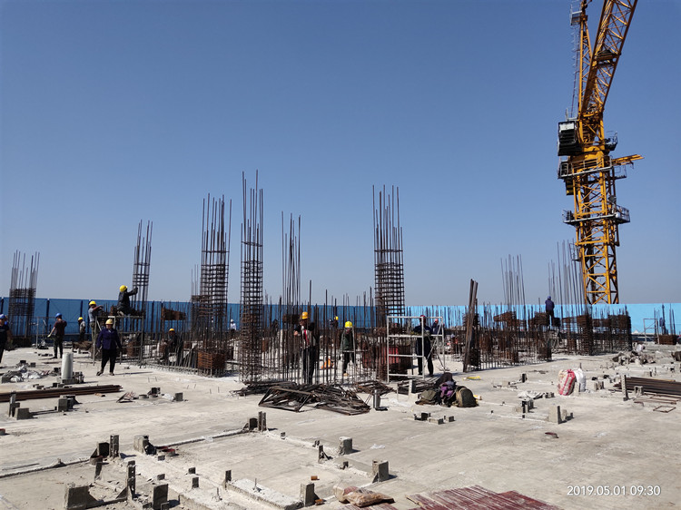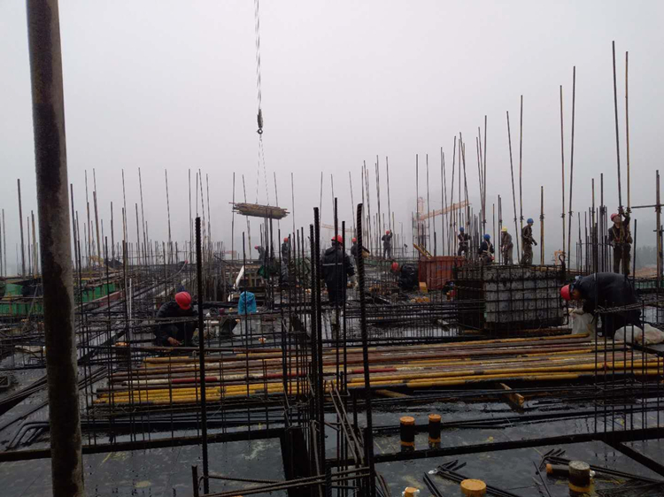 5月2日,十一公司天長恒大I標(biāo)項目班組綁扎基礎(chǔ)承臺鋼筋。