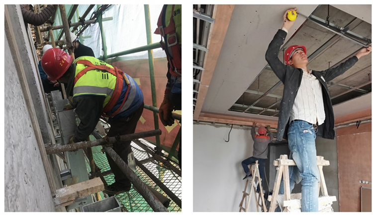 裝飾公司肥東政府中心項目:五一期間正在開展主龍骨角碼安裝作業(yè)以及銅川悅豪酒店項目職工進行頂面木制作。