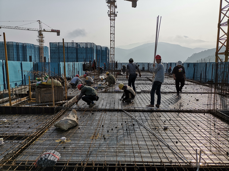 七公司天長恒大湖山半島三標(biāo)段項目、中海江北G06地塊一標(biāo)段兩項目:五一期間,約400位一線職工集體加班搶進度,澆筑混凝土、綁扎鋼筋,澆筑防水保護層。